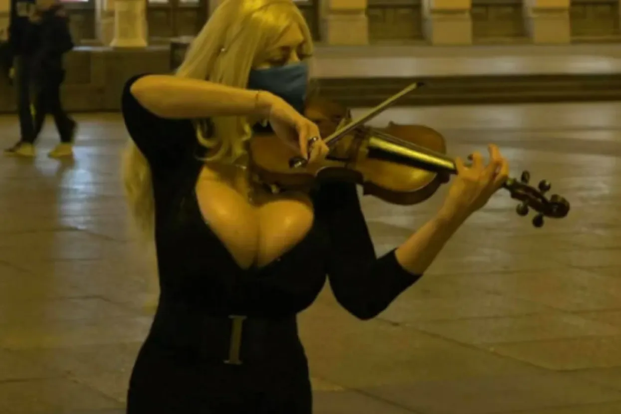 Atraktivna glazbenica bujnog poprsja privukla je pažnju prolaznika na Trgu bana Jelačića. S njom je bio i suprug Roman Brnada, piše 24sata.