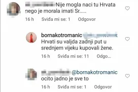 Kotromanić je iznijela još šokantnih tvrdnji, a nakon što je jedan pratitelj komentirao da Pišek “nije mogla naći tu Hrvata nego je morala imati Sr…..”, Borna je odgovorila: “Hrvati su valjda zadnji put i srednjem vijeku kupovali žene”.