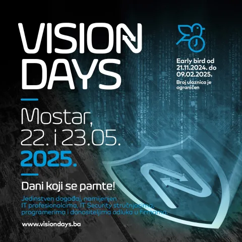 IT konferencija VISION DAYS 2025 održat će se po drugi put u Mostaru 22. i 23.05.2025. u CineStaru, a tema drugog izdanja je „IT sigurnost – vaš ključ uspjeha “.