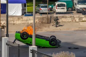 18.10.2021., Pula - Filmska scena ispred Arene u kojoj se zeleni automobil prevrce i zapali. Danas i sutra se u gradu Puli održava snimanje kriminalističke serije "Ze network"
