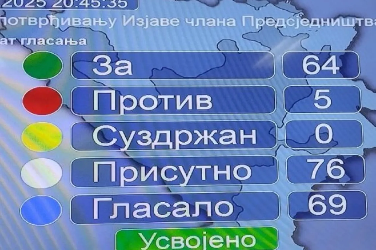 Za potvrđivanje odluke Cvijanovićeve glasala su 64 zastupnika, dok je pet bilo protiv, prenosi RTRS.