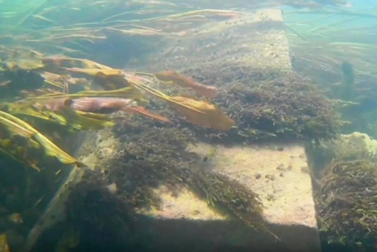 Potraga je uspješno završena. Stigavši na odredište, samo 30-ak metara uzvodno od kupališta, Jerkić nam pokazuje mjesto u vodi gdje su nađeni ostaci kamene konstrukcije.