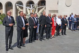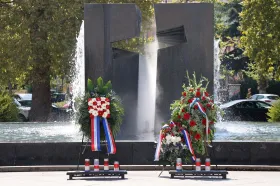 MOSTAR, 28. kolovoza (FENA) – Polaganjem vijenaca i paljenjem svijeća kod spomen-obilježja ispred Hrvatskog doma hercega Stjepana Kosače te okruglim stolom "Krivotvorenje povijesti" u Mostaru je u ponedjeljak obilježeno 30 godina od osnivanja Hrvatske Republike Herceg-Bosne.(Foto FENA/Mario Obrdalj)
