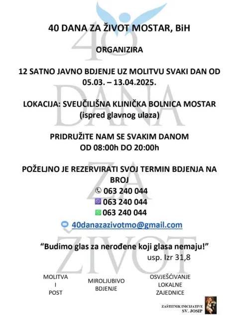 Iz Inicijative '’40 dana za život'' Mostaru pozivaju sve one koji žele da uzmu svoj termin bdijenja porukom (SMS, Viber, Whatsapp) na broj telefona Inicijative 063/240-044, preko društvenih mreža Facebook i Instagram - 40 dana za život Mostar ili na email adresu: [email protected].