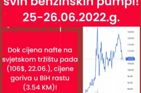 Dok cijena nafte na svjetskom tržištu pada (106 dolara, 22.06), cijene goriva u Bosni i Hercegovini rastu (3.54), piše u pozivu koji kruži društvenim mrežama.