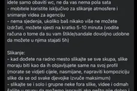 ''Kad dođete na radno mjesto slikajte se sve skupa, slike moraju biti kao da ih objavljujete same na svoj profil (morate se vidjeti cijele, nasmijane, napraviti kompoziciju slike da se od svake djevojke izvuče maksimum). Slikajte se i solo i grupne fora slike, videe i odmah šaljite u grupu da možemo ispraviti ako nešto nije dobro i imamo ih za našu stranicu'', navode.