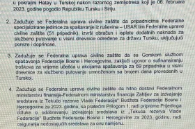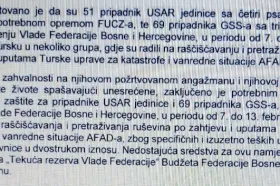 Na sjednici Vlade je konstatirano da su 51 pripadnik USAR jedinice s četiri psa za potrage i kompletnom potrebnom opremom FUCZ-a, te 69 pripadnika GSS-a s tri potražna psa, prema zaduženju Vlade FBiH, u periodu od 7. do 13. veljače upućivani u Tursku u nekoliko grupa gdje su radili na raščišćavanju i pretraživanju ruševina po zahtjevu i uputama Turske uprave za katastrofe i izvanredne situacije AFAD-a.