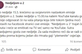 Nedjeljom u 3 trajat će 15 minuta i neće se emitirati na TV-u već samo na YouTubeu. Sutra najavljujemo gosta ove nedjelje. Za sada možemo reći da se radi o čovjeku prema kojemu jedan dio Hrvata gaji 'plemenite' osjećaje", napisao je Stanković na Facebooku.