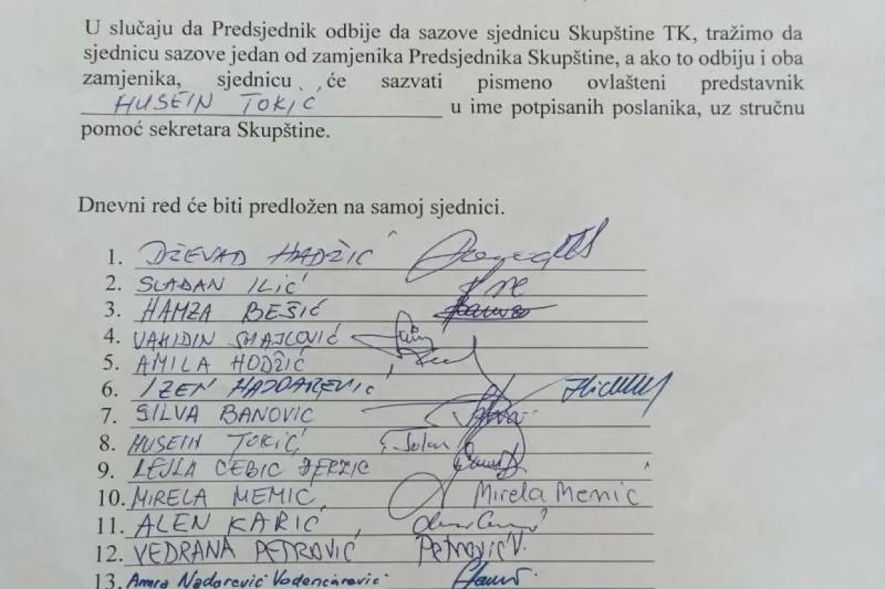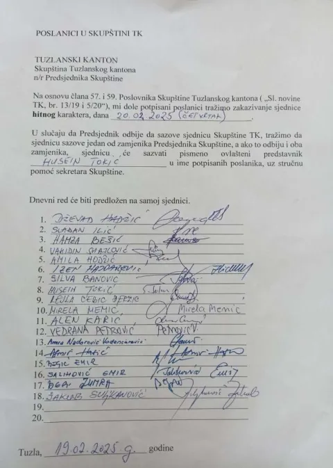 - Na osnovu člana 57. i 59. Poslovnika Skupštine Tuzlanskog kantona („Sl. novine TK, br. 13/19 i 5/20“), mi dolje potpisani poslanici tražimo zakazivanje sjednice hitnog karaktera, dana 20.2.2025. U slučaju da predsjednik odbije da sazove sjednicu Skupštine TK, tražimo da sjednicu sazove jedan od zamjenika predsjednika Skupštine, a ako to odbiju i oba zamjenika, sjednicu će sazvati pismeno ovlašteni predstavnik Husein Tokić u ime potpisanih zastupnika, uz stručnu pomoć sekretara Skupštine - navodi se u dokumentu u čiji uvid je imala Fena.